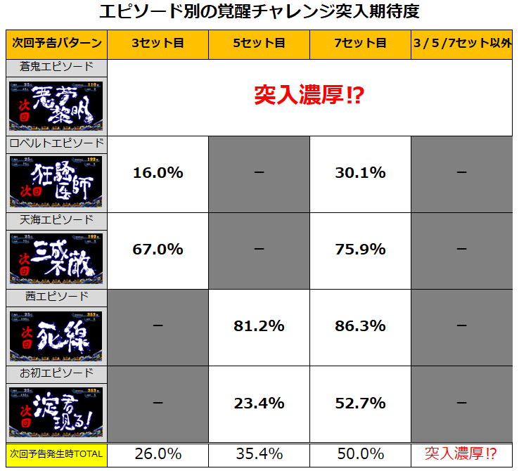 今回は、次回予告発生時の覚醒チャレンジ突入期待度を公開させて頂きます。