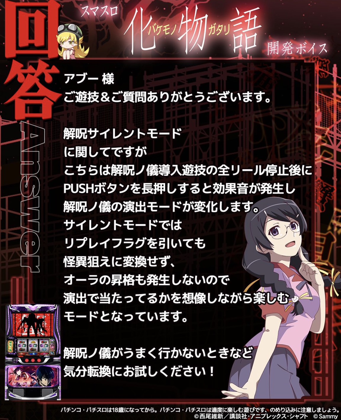 サミー開発ボイスさんの出張部屋にて化物語の解呪の儀でサイレントモードへの変更の仕方が記載されてました。