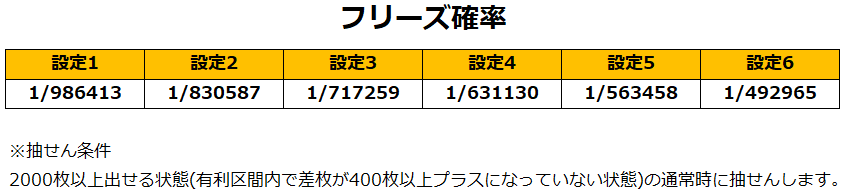 フリーズの数値は「まあこんなもんだよね」というものですけれども、抽選の条件的なもので「2000枚以上出せる場合のみ抽選(差枚400枚以上出ていないとき)」というのも注釈であるんですよね。