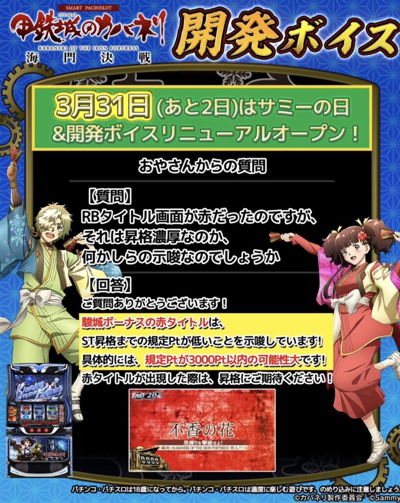 昨日のXでの更新情報では、カバネリ2の「駿城ボーナス・赤画面」にも触れられていました。残り3000PTは前作のメダル機でも見られた要素ですね。