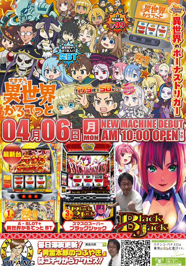 最新台の「A‐SLOT+ 異世界かるてっとBT(サミー系)」と中古台の「スマスロスーパーブラックジャック(山佐系)」の2機種を導入させていただきます!