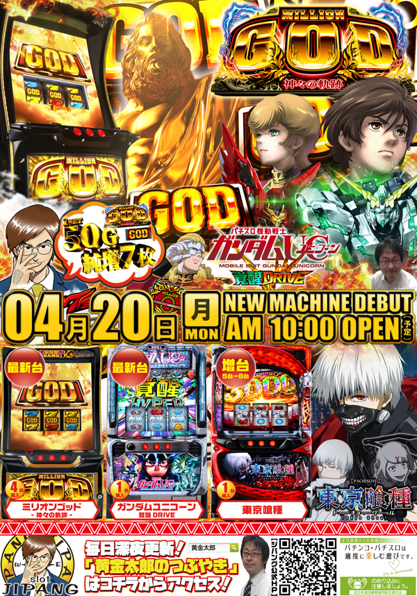 以前からお伝えしていた通り、ジパングでも来週は「ミリオンゴッド‐神々の軌跡‐(4台)」を最速導入予定!